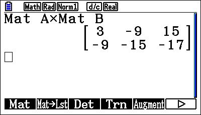 Nous pouvons obtenir la transposée de la matrice A en pressant les touches r {Trn} (matrice transposée), puis q {Mat} (matrice) et a A.