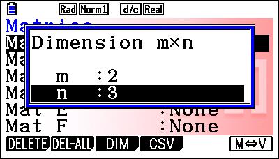 Pour vérifier la dimension d’une matrice, presser w {Dim} (dimension).
