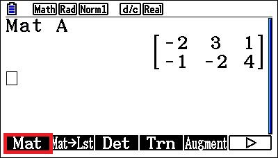 Pour vérifier la matrice A, appuyons sur les touches q {Mat} (matrice) et a A.