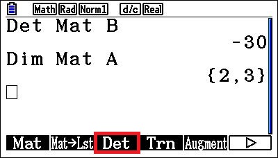 Pour calculer le déterminant de la matrice carrée B, appuyer sur e {Det} (déterminant).