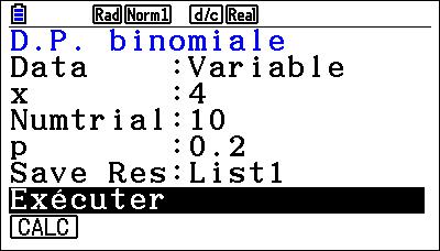 Graph 35+E II/90+E : Loi binomiale avec le menu Statistique