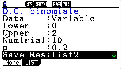 On entre alors les informations dans l’ordre : variable, valeur très basse, nombre de succès maximum, nombre de répétitions, probabilité du succès, List2.