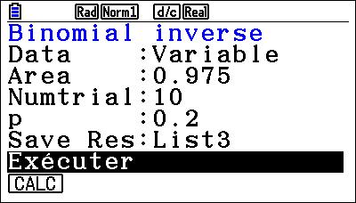 Pour cela, il faut utiliser la fonction InvB (Inverse Binomial Cumulative Distribution), qui correspond à la touche e {InvB}.