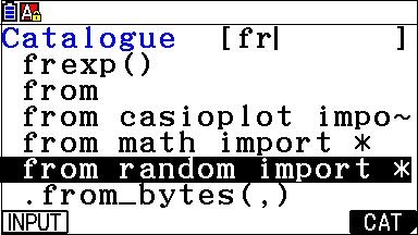 En tapant manuellement la phrase from random import * ou en allant chercher cette dernière dans le catalogue L 4, il est possible de bénéficier de toutes les fonctions de la bibliothèque random.