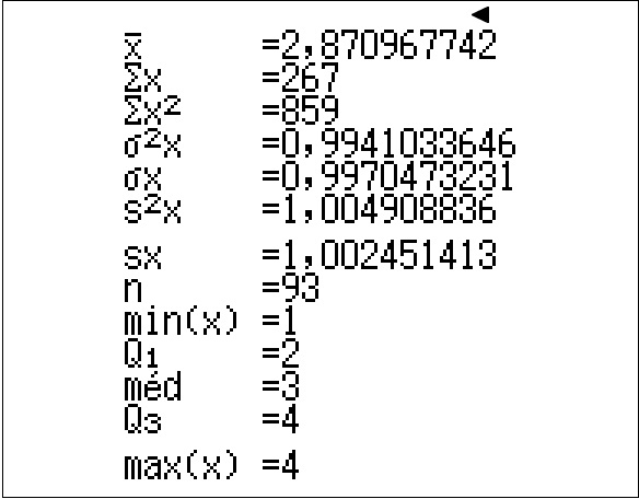 Entrer dans le sous-menu Option en appuyant sur T et choisir Calc à 1 variab avec la touche 3 pour afficher les valeurs des indicateurs statistiques à une variable.