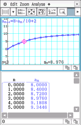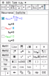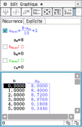 a_{n+1}= \frac{8\times a_n}{10} +2, a_0=8Pour la suite, il sera intéressant d’entrer la formule sous forme fractionnaire. Pour se faire, il faudra presser la touche {Keyboard} et sélectionner a.