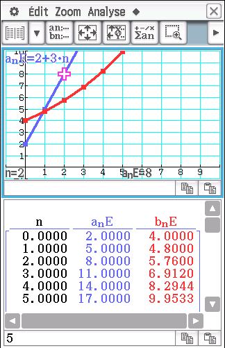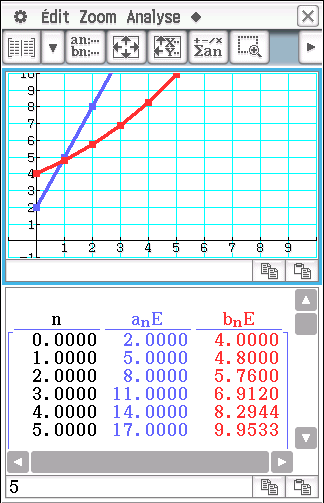 Pour faire apparaître le graphique représentant les termes de suites (a_n) et (b_n) par des points de couleurs, sur la même fenêtre que le tableau de valeurs, presser: