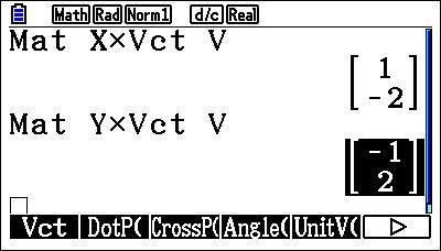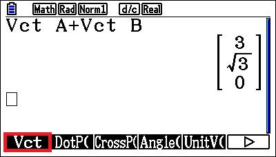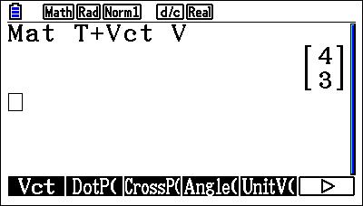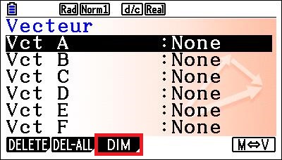 Nous pouvons alors travailler avec les vecteurs créés grâce la touche i puis w {MAT/VCT} (Graph 90+E) / {MAT} (Graph 35+E II) et 2 fois la touche u.