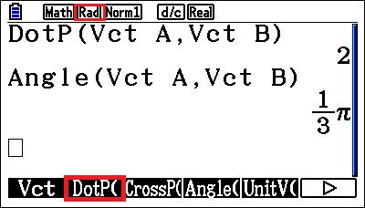 Nous pouvons aussi calculer le produit scalaire de 2 vecteurs. Pour cela, appuyer sur w {DotP(}.