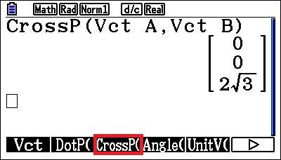 Nous pouvons déterminer le produit vectoriel de 2 vecteurs en appuyant sur la touche e {Cross( }.