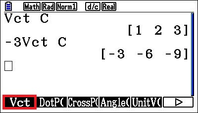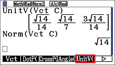 Nous pouvons aussi construire le vecteur unitaire colinéaire au vecteur \vec{C} et de même sens. Pour cela, il faudra presser la touche y {UnitV( }.