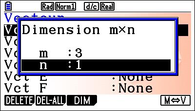 Nous entrons alors les dimensions du vecteur \vec{A}: 3 lignes (m) et 1 colonne (n)