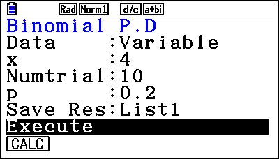Gebruik daarvoor de functie Bpd (Binomial Probability Distribution) via de toets q {Bpd}.