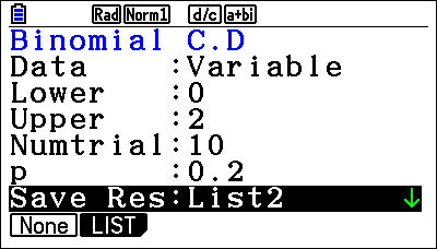 Voer de gegevens in de volgorde: : variabele, zeer kleine waarde, maximaal aantal successen, aantal herhalingen, kans op succes, List2 in.