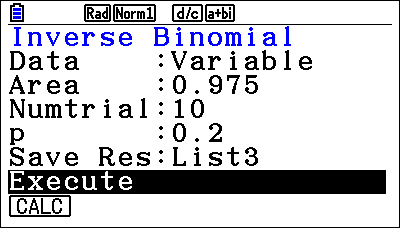 Gebruik daarvoor de functie InvB (Inverse Binomial Cumulative Distribution) via de toets e {InvB}.
