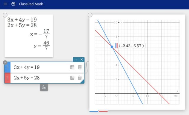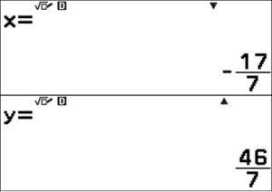 \left\{\begin{array}{l} 3x + 4y = 19 \\ 2x + 5y = 28 \end{array} \right.Druk twee keer op de toets B om de oplossing van het stelsel af te lezen.