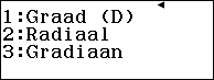 Opmerking: de rekenmachine kan ook ingesteld worden in de modus Radiaal of Gradiaal. Afhankelijk van de gekozen hoekeenheid verschijnt de letter D, R of G bovenaan het scherm.