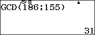 Voer ggd(186,155) in met q r voor de grootste gemeenschappelijke deler en q 3 voor de puntkomma.