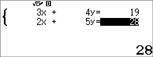 \left\{\begin{array}{l} 3x + 4y = 19 \\ 2x + 5y = 28 \end{array} \right.Druk twee keer op de toets B om de oplossing van het stelsel af te lezen.