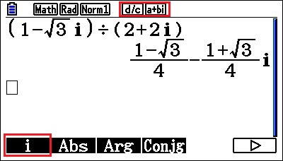 Dans le menu Exe-Mat, nous allons sélectionner les nombres complexes à l’aide de la touche i, puis e{COMPLEX}.