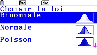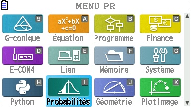 Ouvrir, tout d’abord, le menu Probabilités (Dist sur la Graph 35+E II).