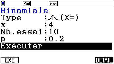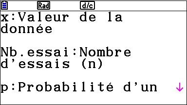 En appuyant sur la touche u {DETAIL}, il est possible d’accéder au descriptif des différents paramètres composant la loi Binomiale.
