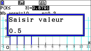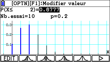 La calculatrice détermine alors la plus petite valeur k telle que la probabilité que X soit inférieur à k soit supérieure au nombre choisi. Ici la plus petite valeur de k telle que la probabilité que X soit inférieur à k soit supérieure à 0,5 est k=2. La probabilité correspondante est 0.6777 au millième près.