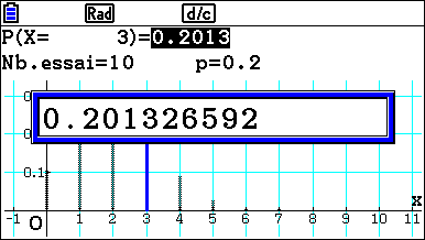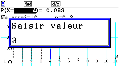 Pour afficher la représentation graphique et le résultat de la probabilité P(X = 4), il faudra appuyer sur Exécuter.