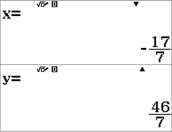 \left\{\begin{array}{l} 3x + 4y = 19 \\ 2x + 5y = 28 \end{array} \right.Après avoir rempli le système, valider à l’aide de la touche B deux fois pour obtenir le couple solution du système.