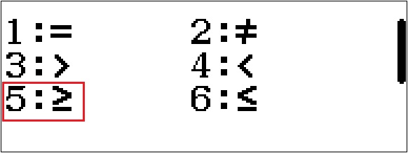 Entrer ensuite dans le sous-menu Option en pressant T pour afficher les symboles mathématiques. Choisir le signe ≥ avec la touche 5.